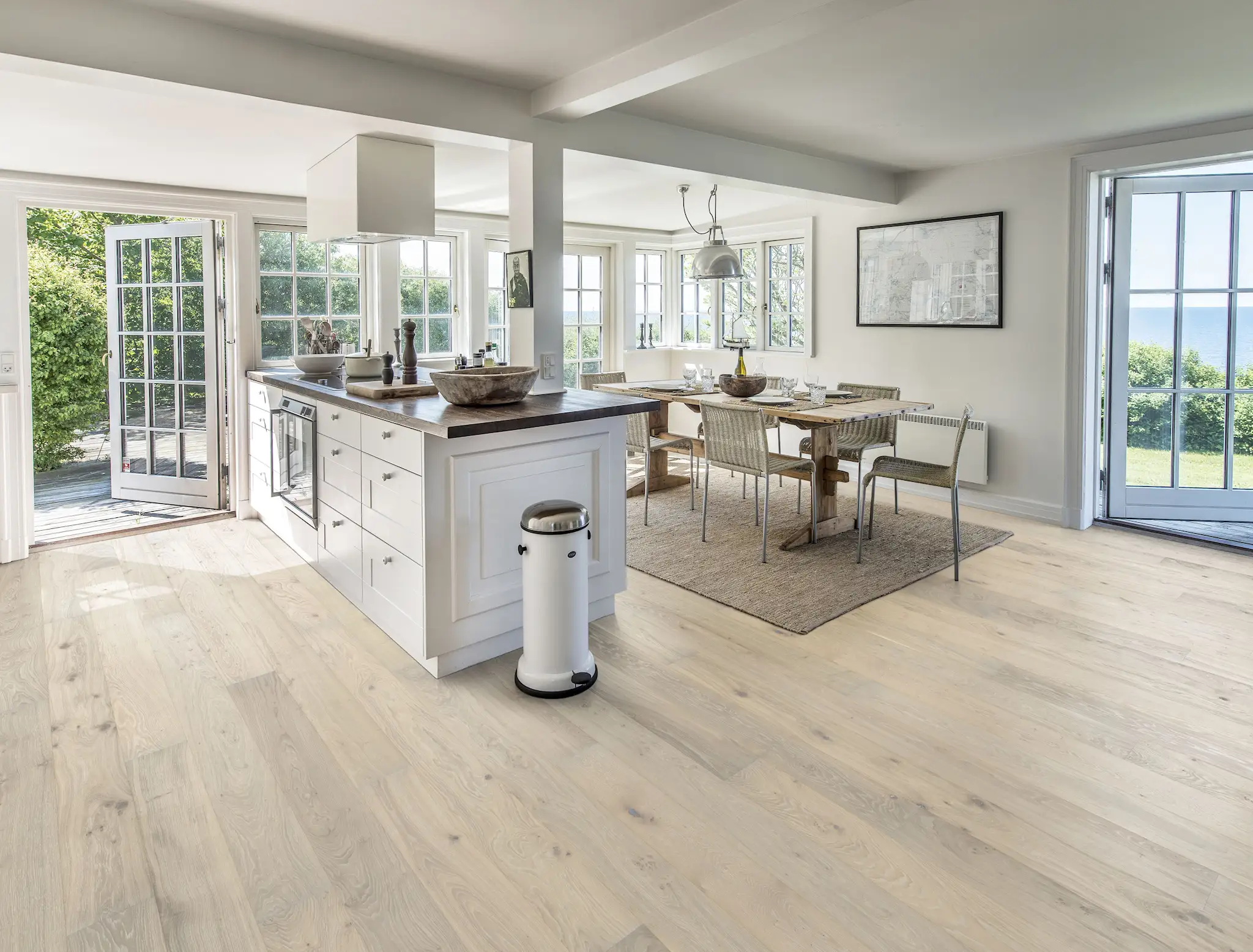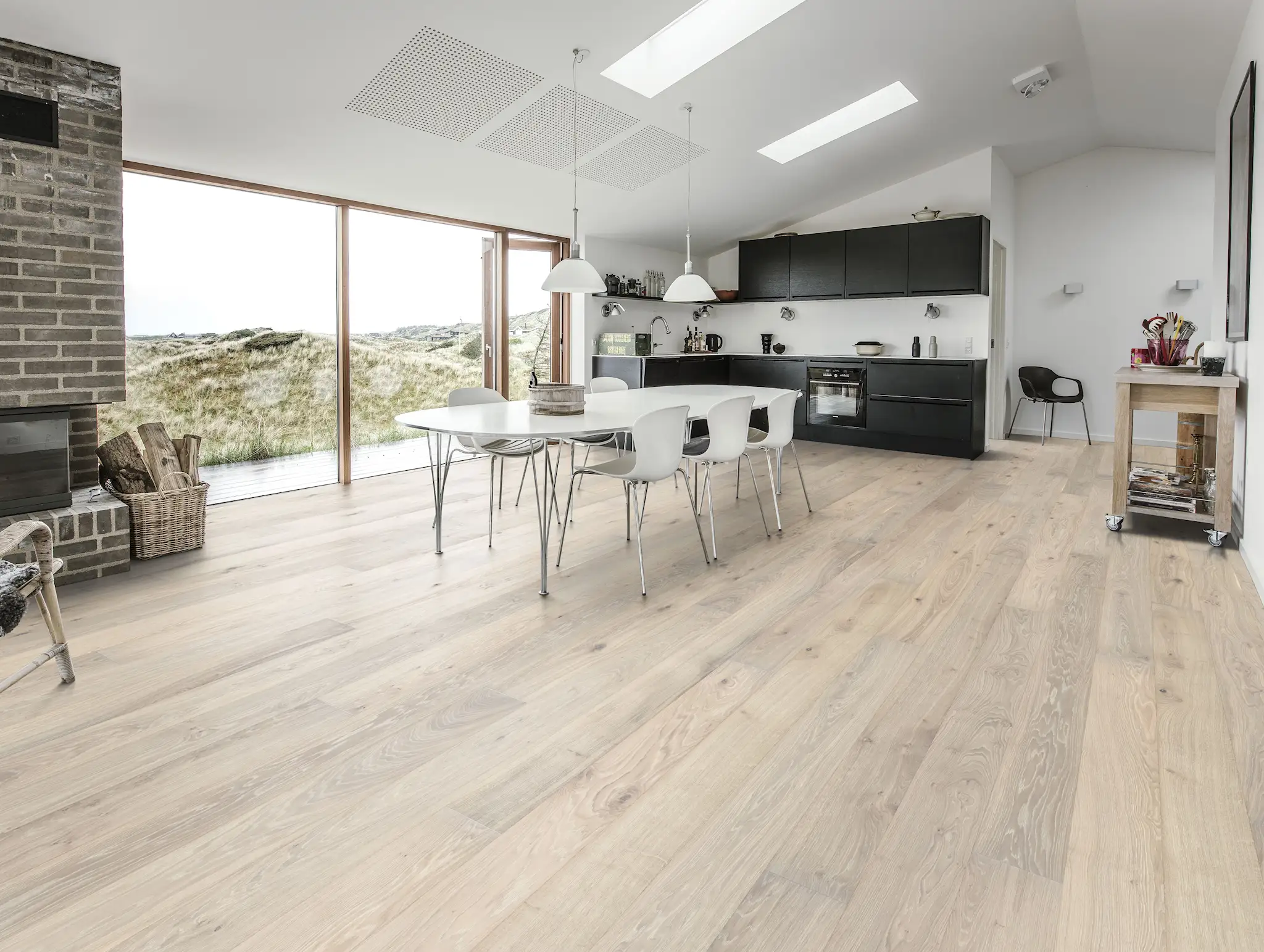 Kahrs Nouveau Blonde 151N8AEKP1KW240 this single-strip oak floor from the Nouveau Collection features a pale white pigment which accentuates the naturally occurring blemishes in the timber. Four-sided micro-beveling at the edging ensures a classic full plank look and feel. This semi-transparent white with balanced contrast allows the warm oak nuances to shine through. The perfect base for a light, Nordic style interior. The matt lacquer finish enhances the natural variations in the wood, creating the impression of newly sawn timber. This helps to eliminate glare while protecting the floor from daily wear.